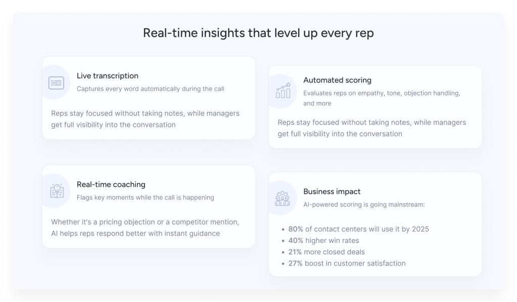 - Automated scoring: AI evaluates reps across key performance dimensions such as empathy, product knowledge, objection handling, and tone. While traditional QA teams typically review only 2% of calls, AI allows for analysis of up to 100%, making coaching more consistent and data-driven [5].