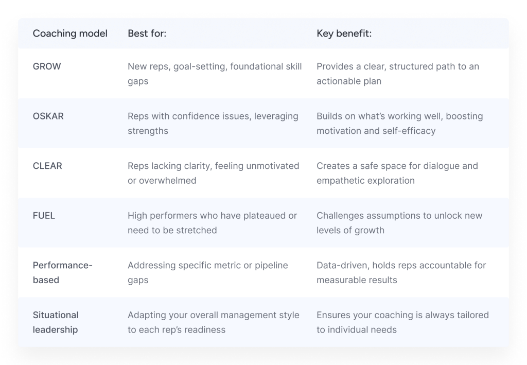 This table outlines coaching models suited for different sales rep needs. GROW guides new reps with goal-setting and skills through a clear plan, while OSKAR builds confidence by leveraging strengths. CLEAR supports reps lacking clarity or motivation with empathetic dialogue, and FUEL stretches high performers to unlock new growth. Performance-based coaching addresses specific metric gaps with data, and Situational leadership adapts coaching to each rep’s readiness