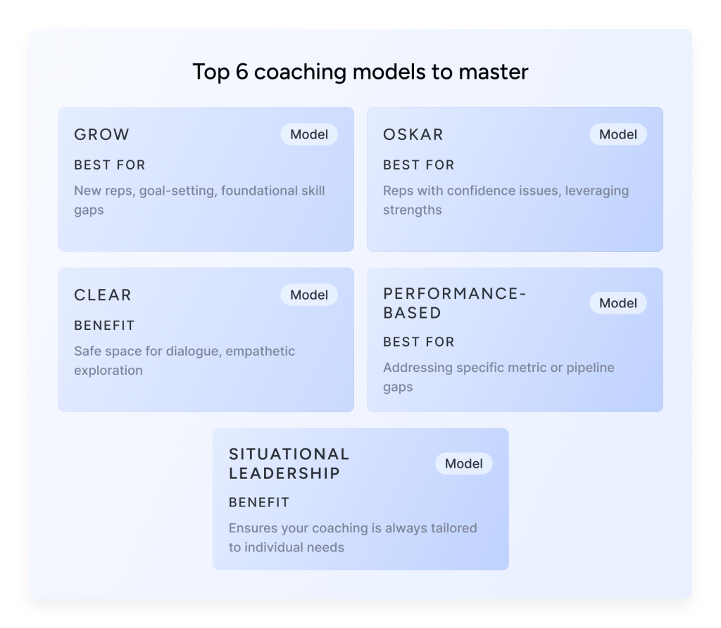 A diverse set of coaching models, namely GROW, OSKAR, CLEAR, FUEL, performance-based, situational leadership, gives you the agility to handle various scenarios, from building fundamental skills with a junior BDR to helping a senior account executive overcome a mental block.