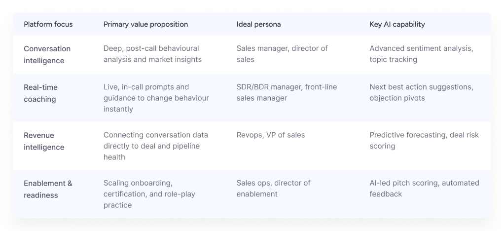 This table compares four types of AI-driven sales platforms. Conversation intelligence tools focus on post-call analysis for managers using sentiment and topic tracking. Real-time coaching delivers in-call prompts for SDRs and managers with next-best-action suggestions. Revenue intelligence connects conversation data to pipeline health through predictive forecasting, while enablement and readiness platforms help scale onboarding and certifications using AI-led feedback and pitch scoring.