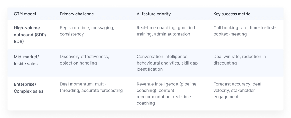The table shows AI coaching focus across sales models. High-volume outbound teams use real-time coaching and automation to cut ramp time and boost booking rates. Mid-market sales prioritize conversation intelligence and analytics to improve discovery and raise win rates. Enterprise teams rely on revenue intelligence and real-time coaching to strengthen forecasting, deal velocity, and engagement.