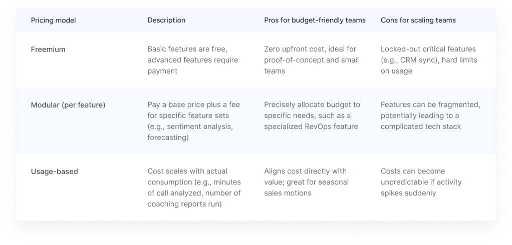 Modular pricing is a sophisticated alternative that offers sales leaders granular control over budget allocation. This model charges based on distinct variables: per user, per feature, or per usage metric (such as call minutes analyzed) [15]. Modular pricing allows a director of sales to allocate budget precisely: dedicating a lower-cost, usage-based plan to the SDR function, for example, while ensuring the AE team has access to higher-tier deal intelligence features required for complex enterprise sales cycles. This level of precision is critical for revenue operations leaders managing tight budgets across fragmented sales functions [14].