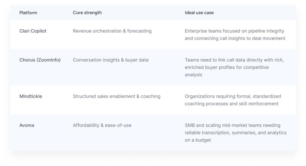 This table compares four post-call analysis platforms: Clari Copilot (revenue orchestration and forecasting for enterprise pipeline integrity), Chorus (ZoomInfo) (conversation insights and buyer data for competitive analysis), Mindtickle (structured sales enablement and coaching), and Avoma (affordability and ease-of-use for SMB transcription and analytics). Each platform targets specific organizational needs, from high-level revenue management to skill reinforcement and budget-conscious analysis
