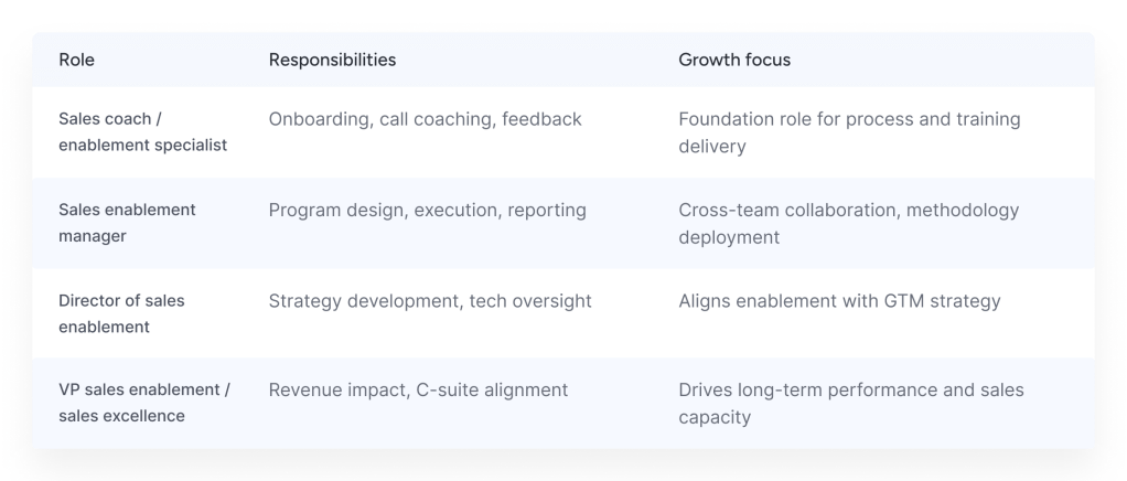 Sales enablement careers typically start with Sales Coaches or Enablement Specialists, who focus on onboarding, coaching, and laying the foundation for training. As Enablement Managers, professionals drive program execution and cross-team collaboration. Progressing to Director of Sales Enablement, the focus shifts to strategy and aligning initiatives with go-to-market goals. At the top, VPs of Sales Enablement lead revenue-impact initiatives and align enablement with long-term business performance.