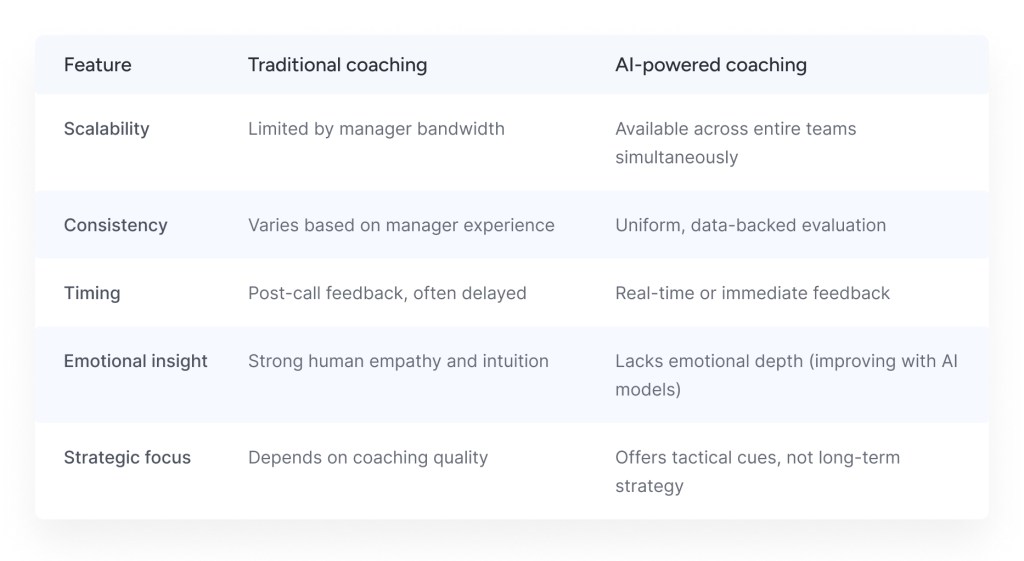 Traditional sales coaching relies heavily on a manager’s time, experience, and intuition, making it hard to scale, inconsistent across reps, and often delayed in feedback. In contrast, AI-powered coaching delivers scalable support across teams, with real-time, data-driven insights. While it still lacks the emotional depth of human empathy, AI tools offer consistent evaluations and immediate tactical feedback, though they currently focus more on short-term performance than long-term strategic development