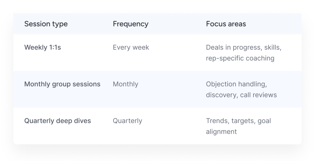 - Create a predictable rhythm with weekly one-on-ones, pipeline reviews, and call coaching [5]