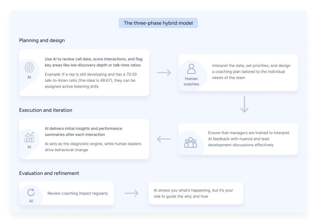 Let AI systems handle foundational coaching, call scoring, behavioral analytics, and performance trends, while managers focus on deal strategy, mindset development, and personalized growth.