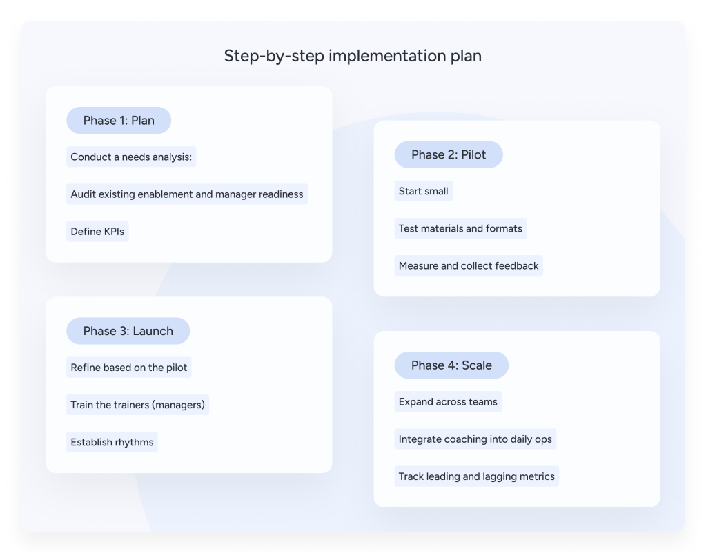 The foundation lies in clear coaching principles and behavior-based development. Once established, AI-driven enablement unlocks scale and precision. Tools like real-time feedback, call analysis, and contextual guidance ensure coaching doesn’t stop after onboarding, it evolves with every deal, rep, and pipeline stage.