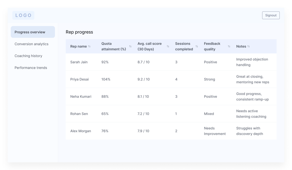 Despite being foundational to rep development, traditional coaching often falls short due to time limitations, inconsistent approaches, and underutilized feedback loops
