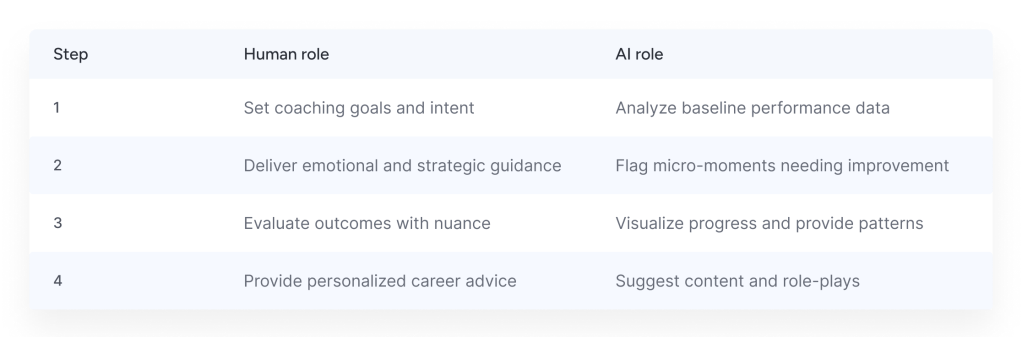According to The People Space, AI coaching works best when paired with human empathy. A hybrid model is ideal: AI manages repetitive analysis while managers bring context, mentorship, and emotional support [8]