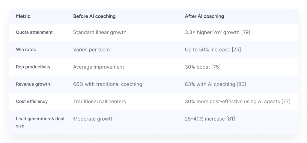 Effective sales coaching directly correlates with performance metrics that matter most to revenue teams. When implemented strategically and consistently, the returns are substantial.